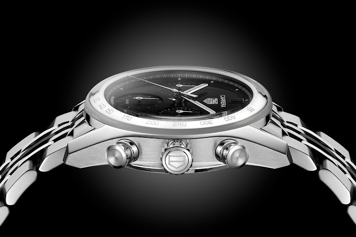 The bracelet follows TAG Heuer’s seven row beads of rice design, reintroduced earlier this year. For this edition, it is reworked with black PVD on the central links to echo the watch’s contrasted look.